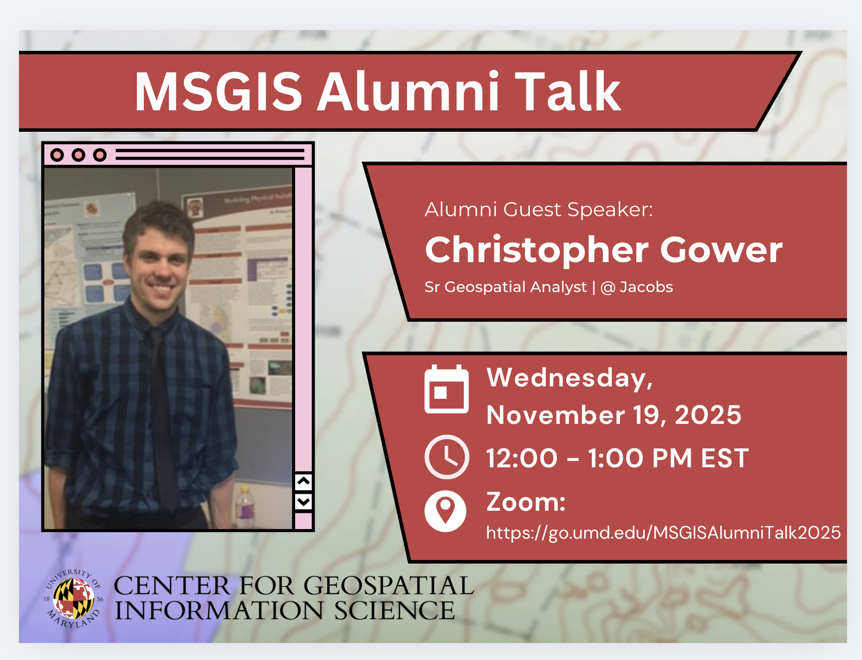 MSGIS Alumni Career TalkHear from MSGIS alum Christopher Gower, now a senior geospatial analyst at Jacobs, as he shares his career path in government and industry. He’ll discuss lessons learned as a GIS professional and offer advice for launching a successful career in geospatial technology. Date: Wednesday, Nov. 19 |