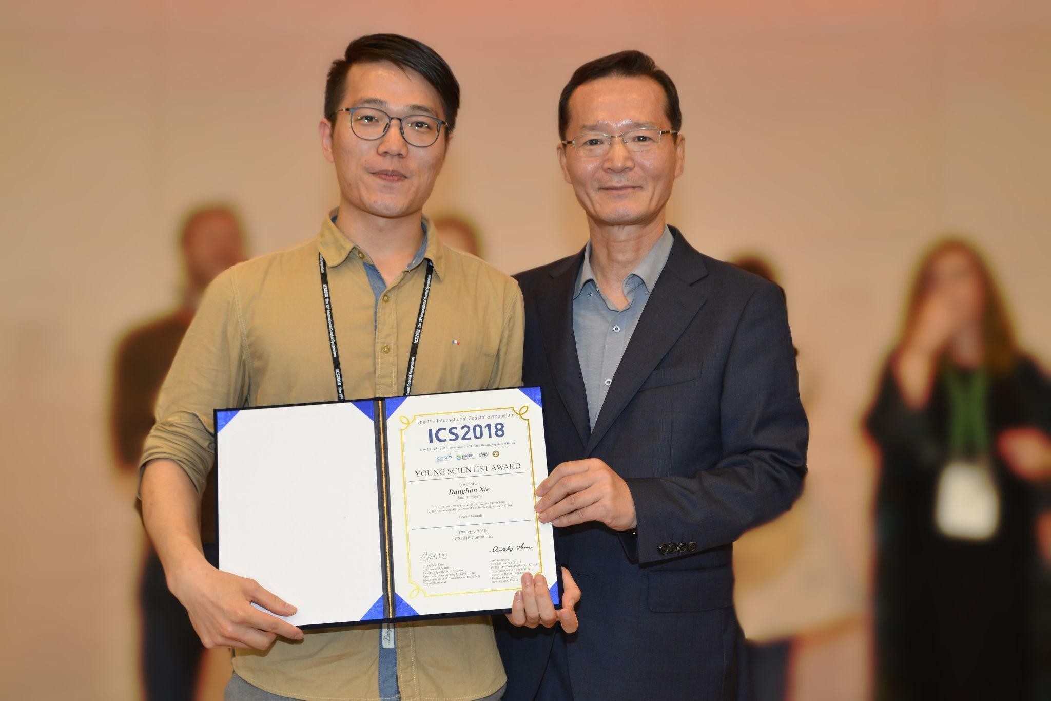 Xie (left) receives the Young Scientist Award at the 2018 International Coastal Symposium in Busan, South Korea.