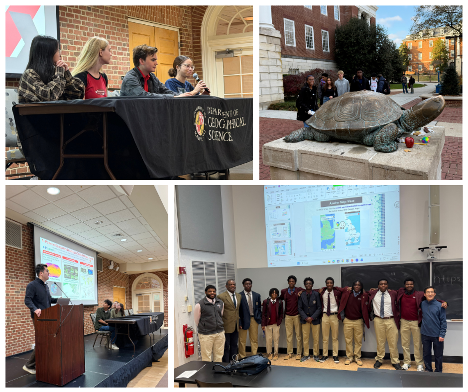 Top left clockwise: Undergraduate student panel; campus tour at Testudo; DeMatha group with senior lecturer Naijun Zhou; and Ph.D. Sstudent Zhihao Wang on the use of AI in ecosystem modeling