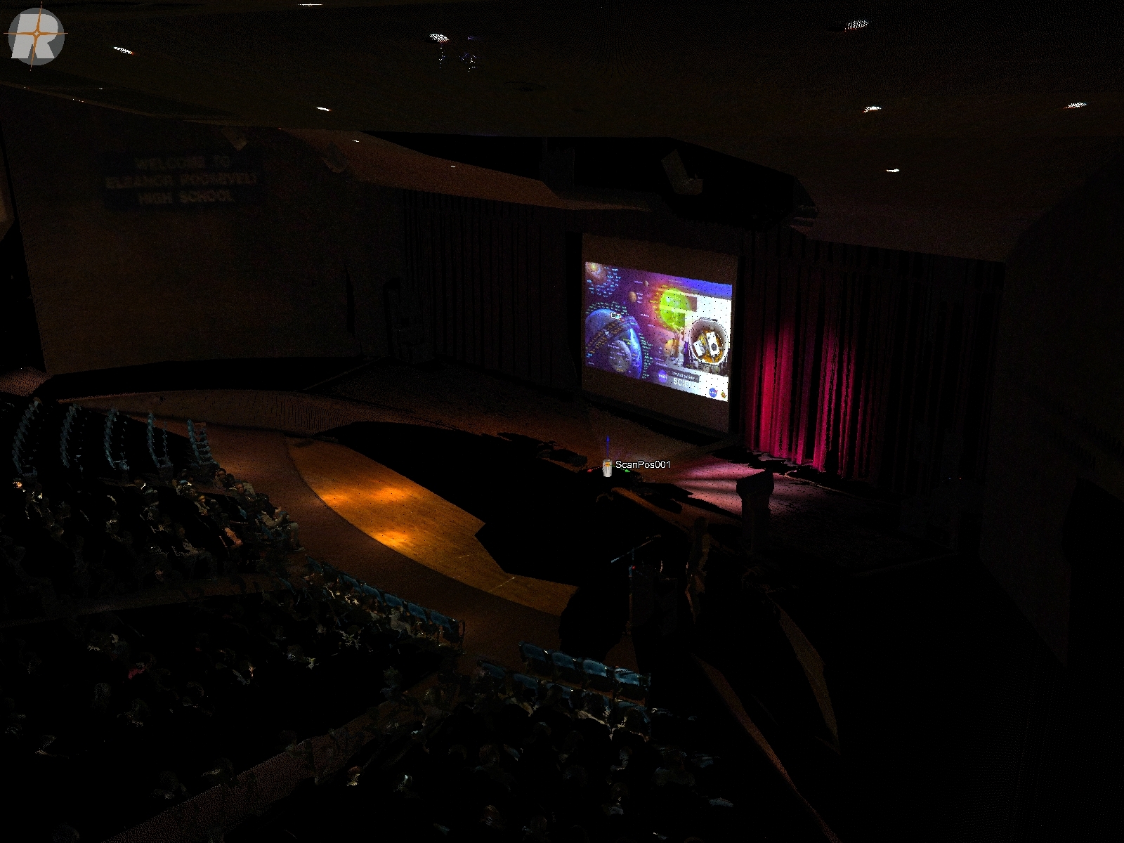 From the terrestrial laser scanner’s vantage point, the auditorium comes into focus as lidar data and space-based observations are projected on screen, linking ground-based measurements with GEDI science. Courtesy of the GEDI team