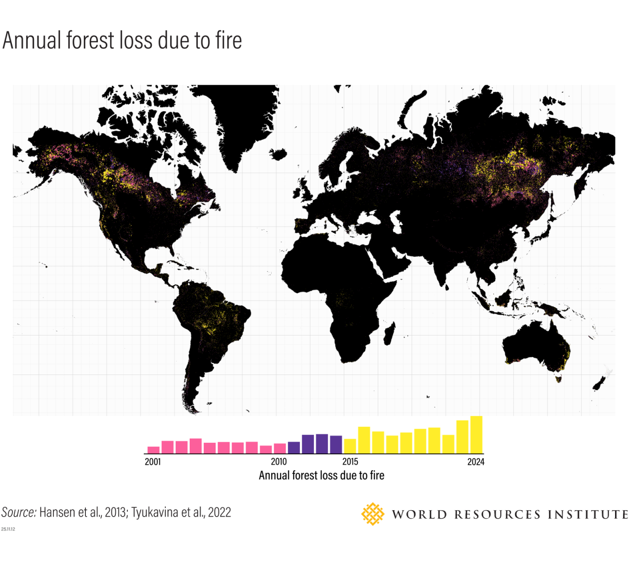 Let’s look at wildfires. As the graphic below shows, large-scale fires burned more than twice as much forest over the past decade (2015-2024) than they did in the previous one (2001-2010). A warming climate is creating hotter, drier conditions for longer periods of time, escalating fire risk.